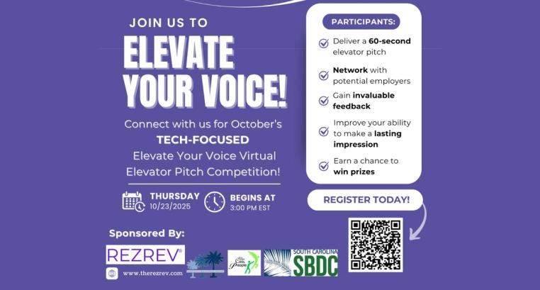 Step into the spotlight at Elevate Your Voice, an online elevator pitch competition with a technology focus, hosted by Rez Rev and OnePlusOne Productions in collaboration with SC SBDC.