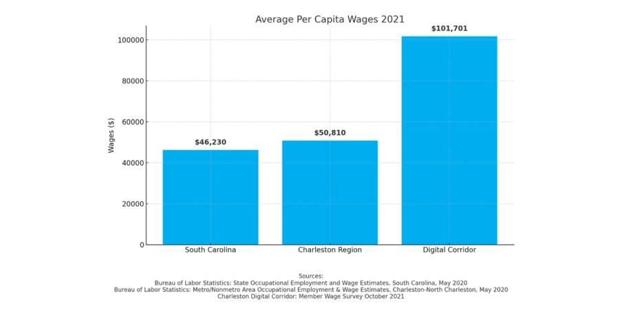 In its Annual Wage & Job Growth Survey, the Charleston Digital Corridor is pleased to announce that the average per-capita wage at companies participating in the 2021 survey is $101,710 - a considerable increase from the previous year average of $91,183. This number is more than twice the State of South Carolina's average wage of $46,230 and Charleston Region average wage of $50,810 according to the latest (May 2020) data available from the US Bureau of Labor Statistics.
